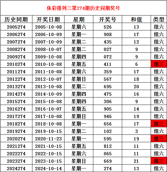 2025年10月15日排列三第274期开奖,历史同期分别开出奖号: