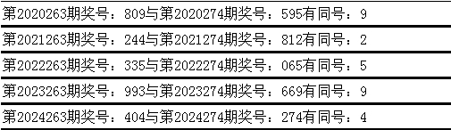与前期历史同期奖号对比分析,在最近五年开奖中,第263期同期奖号与第274期同期奖号都出现了相同号码: